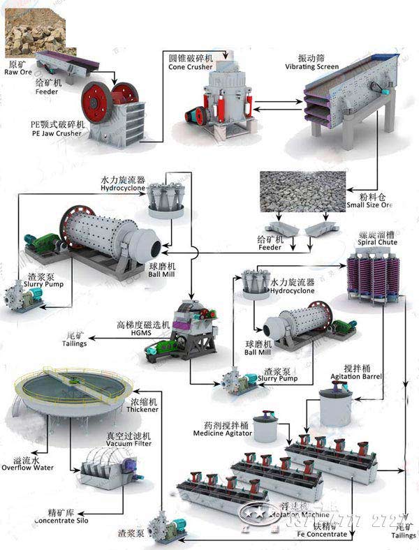 整個(gè)赤鐵礦選礦生產(chǎn)線采用兩段磨礦流程,這樣既能有效地提高生產(chǎn)效率,又能減少資源的浪費(fèi),節(jié)省成本。磨礦第一段選別采用一臺(tái)磁選機(jī),二段選別采用一臺(tái)粗選磁選機(jī)一臺(tái)精選磁選機(jī),既能有效地提高生產(chǎn)產(chǎn)量,又能達(dá)到有效地達(dá)到磨礦細(xì)度,另外,磁選過(guò)程中添加了脫磁流程,主要作用是脫去礦物自身所帶的磁性,提高精礦的品味。經(jīng)過(guò)磁選機(jī)分選的赤鐵礦物料要被送入浮選機(jī),根據(jù)赤鐵礦的特性加入相應(yīng)的藥劑,將赤鐵礦精礦選別出來(lái),之后將含有大量水分的赤鐵礦物料送入濃縮機(jī)進(jìn)行縮水作業(yè),之后經(jīng)烘干機(jī)烘干即為干燥的成品物料。