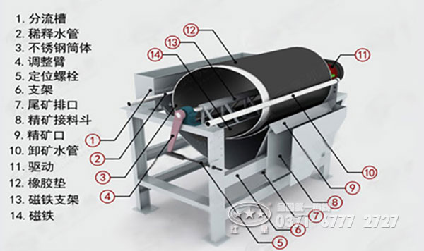 鈉長石磁選機在工作時,礦漿經(jīng)給礦箱流入槽體后,在給礦噴水管的水流作用下,礦粒呈松散狀態(tài)進入槽體的給礦區(qū)。在磁場的作用下,磁性礦粒發(fā)生磁聚而形成磁團或磁鏈,其磁團或磁鏈在礦漿中受磁力作用,向磁極運動,被吸附在圓筒上。由于磁極交替而產(chǎn)生磁攪拌現(xiàn)象,被夾雜在磁團或磁鏈中的脈石等非磁性礦物在翻動中脫落下來,隨后被吸在圓筒表面的磁團或磁鏈即是精礦。精礦隨圓筒轉到磁系邊緣磁力較弱處,在卸礦水管噴出的沖洗水流作用下被卸到精礦槽中。非磁性或弱磁性礦物被留在礦漿中隨礦漿排出槽外,即是尾礦。